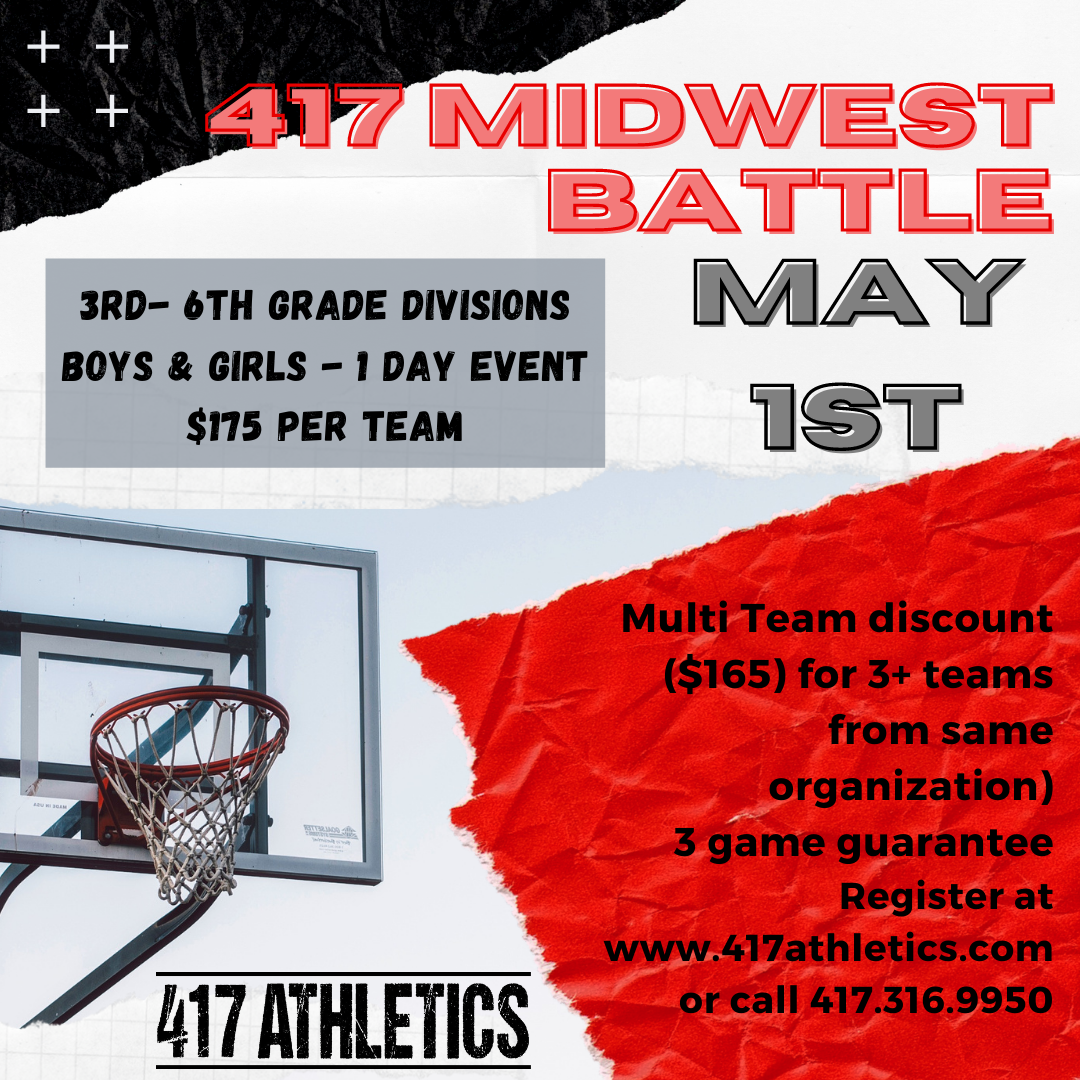 417 Midwest Battle 417 Midwest Battle Standard 300 W Hayward Dr, Mt Vernon, MO 65712, USA Share REGISTER NOW ProfilePhotos 3rd-6th grade divisions boys & girls $175 per team 3 game guarantee $5 spectator fee Loading... No Records Found Sorry, no records were found. Please adjust your search criteria and try again. Maps failed to load Sorry, unable to load the Maps API. Event Details From: May 1, 2021 To: May 1, 2021 300 W Hayward Dr, Mt Vernon, MO 65712, USAShow contact Registration Link Phone: 417.316.9950 Email: 417programs@417athletics.com Close