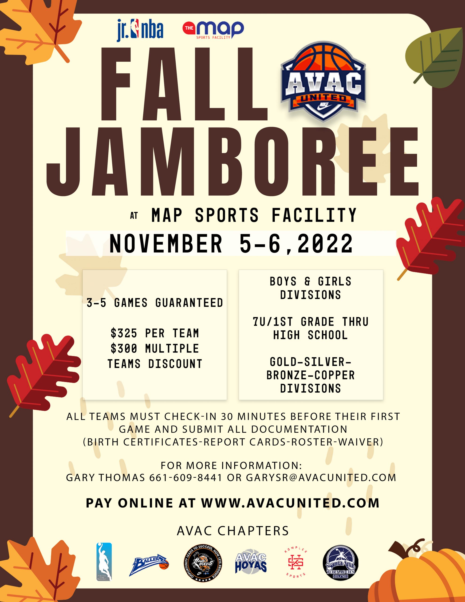 AVAC United 10th Annual "Fall Jamboree" Tournament AVAC United 10th Annual "Fall Jamboree" Tournament Standard 12552 Western Ave, Garden Grove, CA 92841 Share REGISTER NOW ProfilePhotos November 5th & 6th 2022 @ Map Sports Facility & AIM Sports Facility 8U-High School (Boys & Girls) For registration go to AVACUNITED.COM !! Loading... No Records Found Sorry, no records were found. Please adjust your search criteria and try again. Maps failed to load Sorry, unable to load the Maps API. Event Details From: November 5, 2022 To: November 6, 2022 12552 Western Ave, Garden Grove, CA 92841Show contact Registration Link Phone: 661-609-8441 Email: garysr@avacunited.com Close