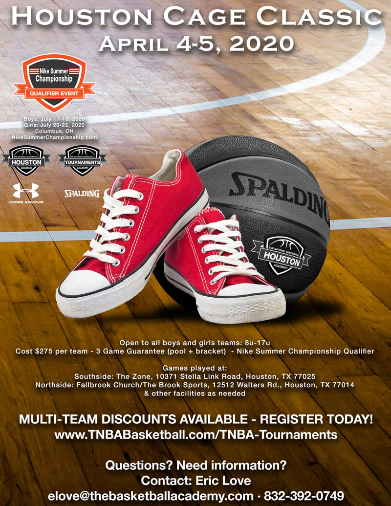 Houston Cage Classic Houston Cage Classic Standard 10371 Stella Link Rd, Houston, TX 77025, USA Share REGISTER NOW ProfilePhotos $275 per team- 3 Game Guarantee (pool + bracket) Nike Summer Championship Qualifier Loading... No Records Found Sorry, no records were found. Please adjust your search criteria and try again. Maps failed to load Sorry, unable to load the Maps API. Event Details From: April 4, 2020 To: April 5, 2020 10371 Stella Link Rd, Houston, TX 77025, USAShow contact Registration Link Phone: 832-392-0749 Email: elove@thebasketballacademy.com Close